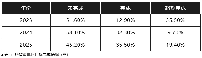 各省级地区以往的目标完成情况是怎样的呢?各地的完成情况可分为三类。无论目标是单一数值,还是接近或高于目标范围,结果有三种:(1)未完成;(2)完成;(3)超额完成。表2列出了2023年至2025年省级地区未完成、完成和超额完成目标的比例。随着时间推移,目标完成率有所提高。2025年,大多数省份都实现了既定目标。