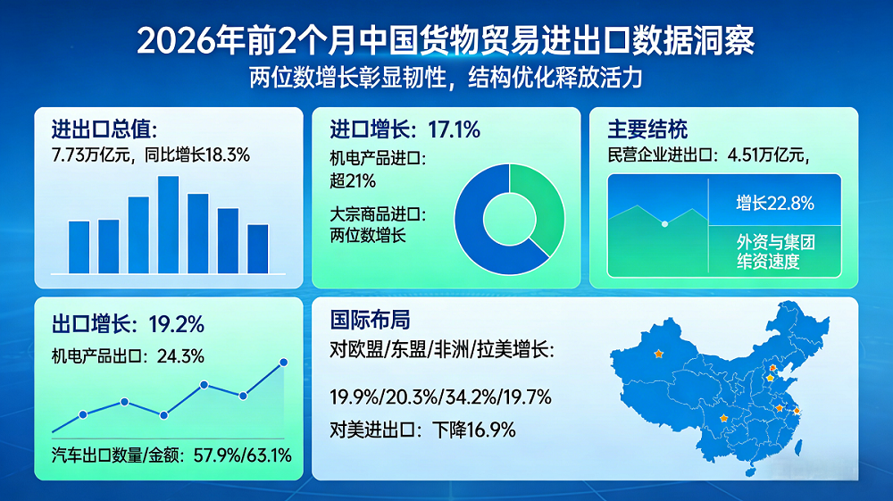 2026年,正值十五五规划开局之初,中国外贸便交出了一份令人惊叹的满分卷。海关总署2026年3月10日发布数据,2026年前2个月中国货物贸易进出口总值高达7.73万亿元,同比增长18.3%。这不仅是自2024年1月以来首次重回两位数增长,更在1月、2月分别录得13.6%和24.5%的高增速。即便扣除春节因素的扰动,这列中国制造号列车依然在全速飞驰,稳中有进的态势不仅彰显了韧性,更释放出强劲的复苏活力。