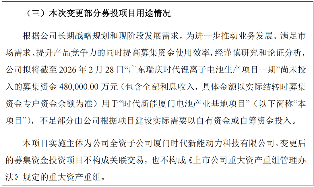 根据公告,宁德时代2025年通过定向增发募集净额约448.7亿元,截至2026年2月底已使用393.7亿元。此次调整的资金来源于“广东瑞庆时代锂离子电池生产项目一期”,该项目规划产能30GWh,目前已完成第一阶段投产,尚有52.6亿元募集资金未动用。公司决定将其中48亿元转投至全资子公司厦门时代新能动力科技有限公司实施的“时代新能厦门电池产业基地项目”。