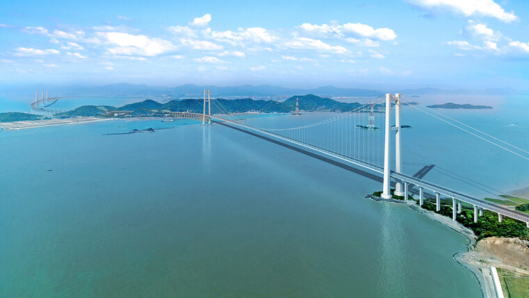 双屿门特大桥坐落于浙江舟山,连接六横岛与佛渡岛,是六横公路大桥二期工程的关键控制性工程。大桥主跨1768米,东主塔高246.3米,横跨双屿门水道,是国内最大跨度跨海大桥,也是世界最大跨度单跨吊钢箱梁悬索桥。