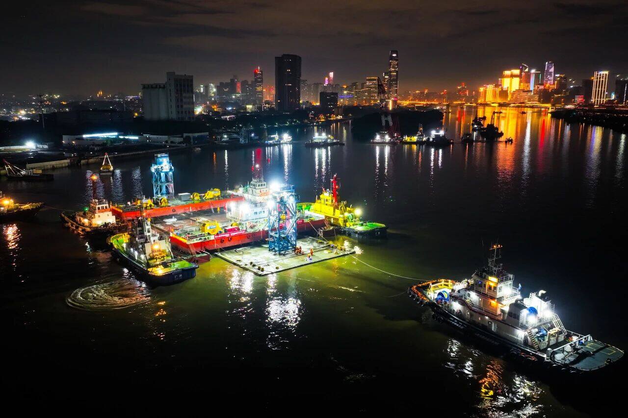 隧道沉管段总长935米,共设9个大型管节,分三批次进行预制与安装。本次沉放的E3管节为首批沉管的最后一节,管节长105.5米、重约2.8万吨,浮运距离约3.6公里,整体浮运与安装用时两天。在航道狭窄、水流条件复杂的珠江水域,实现如此巨型构件的精准就位,堪称江底穿针引线。