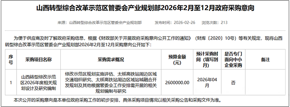 太绥高铁前期工作再传新进展。吕梁段可研征拆概算调查核实、5个站城融合规划方案编制,以及山西转型综改示范区太绥高铁站周边区域站城融合开发规划编制采购意向已于2月发布,计划于2026年3—4月启动招标。