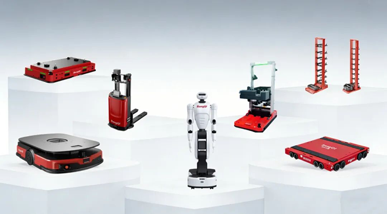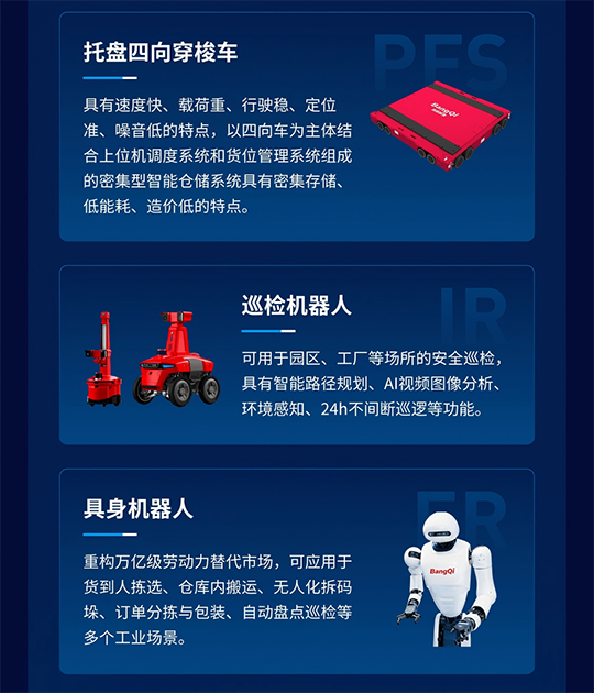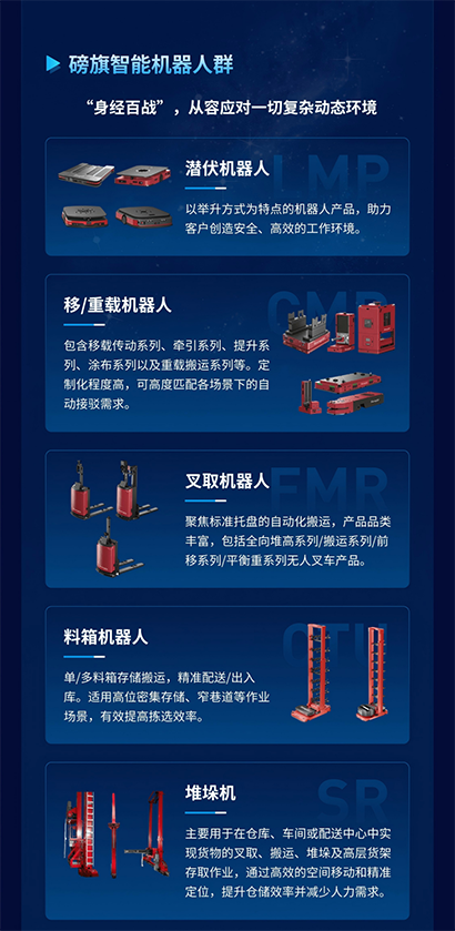 AGV/AMR集群:这是磅旗实现全域协同的主力军,包括潜伏叉取机器人、堆高机器人、双举升机器人、重载搬运机器人、料箱机器人、单悬臂等全系列产品,构成厂内物流的智能毛细血管。