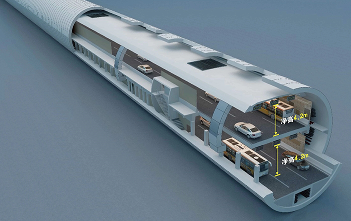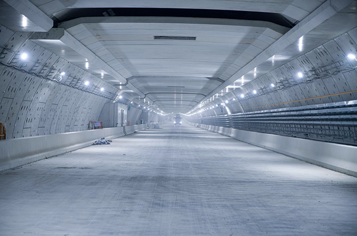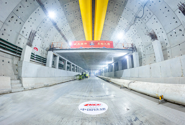盾构隧道贯通后,内部二次结构施工同步推进。上层车道板位于隧道中部,将单洞空间分为上下两层,既是上层车辆通行的承重结构,也为管线铺设、通风设备安装等后续工序提供支撑。该车道板采用现浇混凝土工艺,施工规模大、技术要求高。