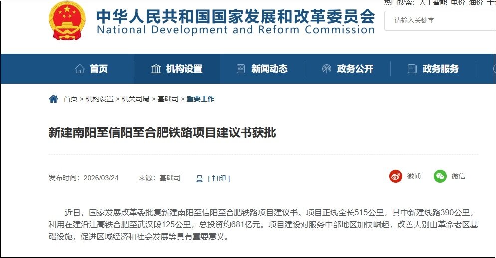 2026年3月24日,南阳至信阳至合肥铁路建设迎来关键进展,这条承载着中部崛起希望、串联大别山革命老区的高铁线路,正以蓬勃之势加速从规划走向现实。