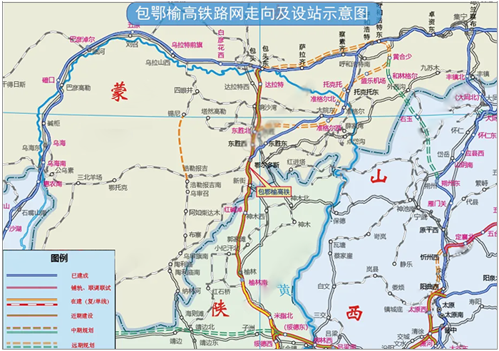 包鄂榆高铁是国家八纵八横高速铁路包银海通道的重要组成部分,线路由包头经鄂尔多斯抵达榆林,全长277公里。当前通道内西延高铁已开通、延榆高铁正建设,包鄂榆高铁是通道唯一未批复段落,也是补短板关键路段。项目建成后,将打通黄河流域十字型纵向高铁通道,构建呼包鄂榆城市群城际网络主骨架,大幅缩短沿线多座城市通达时间,全面提升群众出行便捷度与舒适度,为蒙陕两地发展及交通强国建设提供强力支撑。