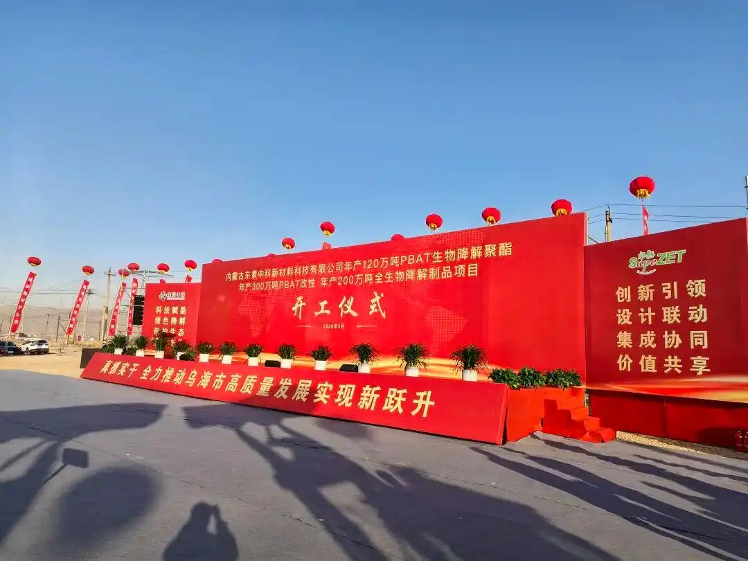 2026年3月26日,内蒙古东景中科新材料科技有限公司PBAT全产业链项目举行开工仪式。项目总投资约107亿元,将助力乌海市打造可降解新材料产业高地,构建全产业链+龙头引领的特色产业集群。
