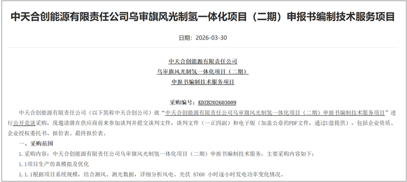 2026年3月30日,中天合创能源有限责任公司就乌审旗风光制氢一体化项目二期申报书编制技术服务,启动公开竞谈采购工作。项目规划建设10万千瓦光伏、40万千瓦风电,配套年产氢气2万吨、合成氨不低于10万吨。早在2025年10月,该项目已完成节能评估、碳排放评价、两高论证及可行性研究报告编制,本次采购工作启动,意味着项目正式向开工建设阶段迈进。