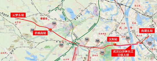线路西起既有汉十高铁云梦东站,沿线新建孝感南站、汉阳站2座客运站,经白沙洲长江公铁大桥跨越长江后衔接武黄城际铁路,新建正线全长79.02公里。线路采用分段设计时速:城外长途区段按350公里每小时设计,保障跨省高铁通行效率;武汉主城区段按250公里每小时设计,兼顾城际通勤与枢纽衔接功能。