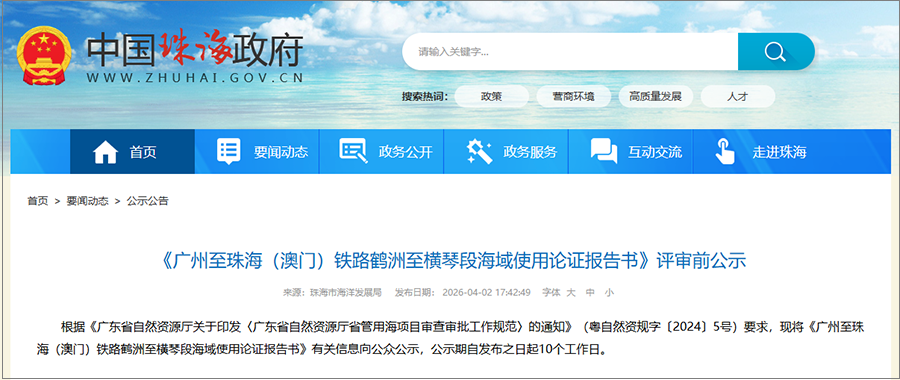 近日,《广州至珠海(澳门)铁路鹤洲至横琴段海域使用论证报告书》评审前公示发布,项目可研及初步设计批复前期工作全面展开,计划年内开工建设。