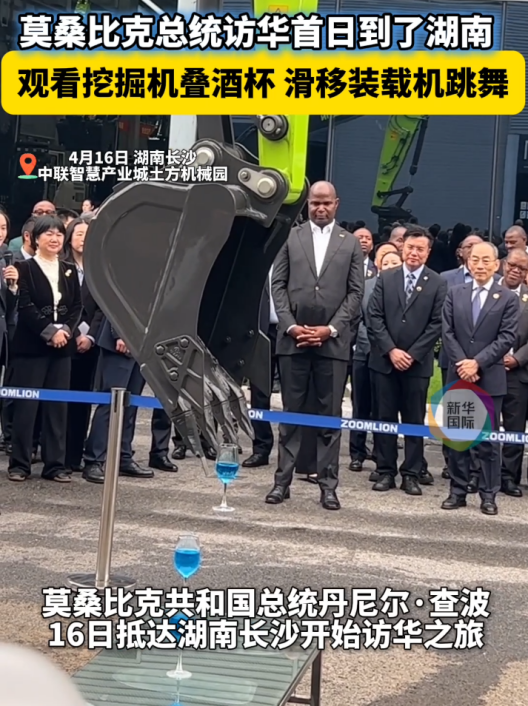 访问首日(4月16日),查波总统便来到中联重科智慧产业城土方机械园。在这里,他现场观看了中国制造的挖掘机表演“穿针”、“叠酒杯”以及滑移装载机“跳舞”等高难度动作,对中国智能装备的精湛操控与卓越性能表示由衷赞叹。