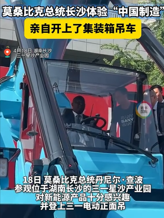 4月18日,查波总统参观了位于长沙的三一星沙产业园。他对园区展示的新能源产品表现出浓厚兴趣,并亲自登上三一电动正面吊,在技术人员的指导下体验了该设备的操作。