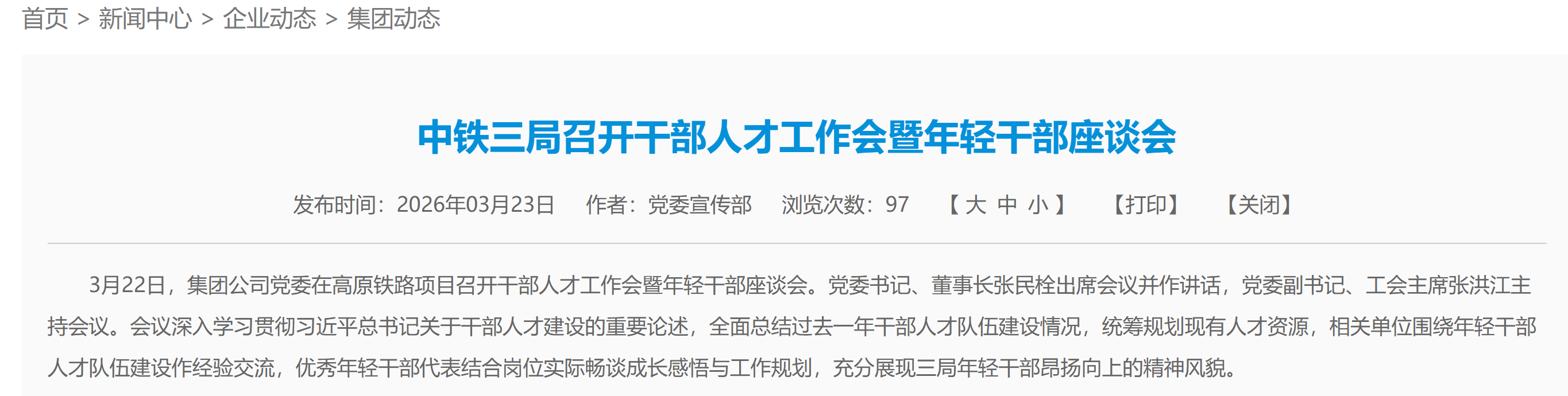 此前,中铁三局集团有限公司党委书记、董事长为张民栓,其3月22日还出席了中铁三局干部人才工作会暨年轻干部座谈会。