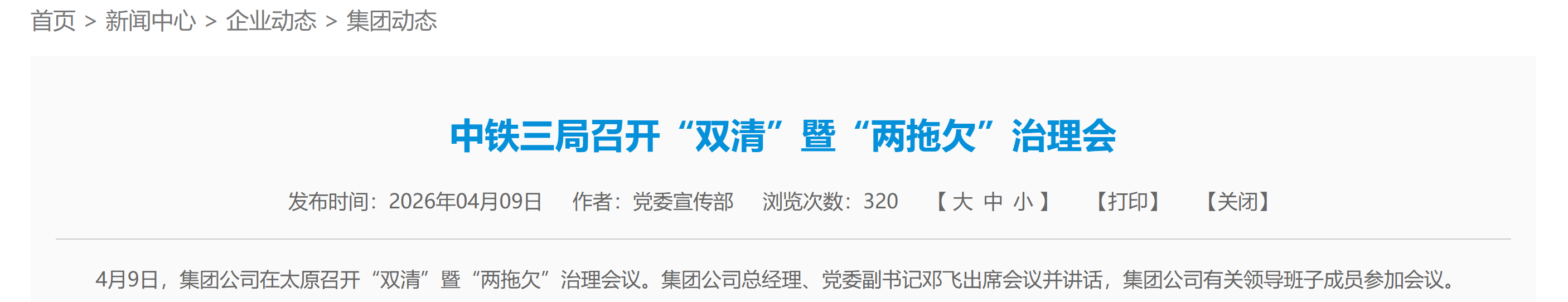 此前,中铁三局集团有限公司总经理、党委副书记为邓飞,其4月9日刚刚出席了中铁三局集团“双清”暨“两拖欠”治理会议。