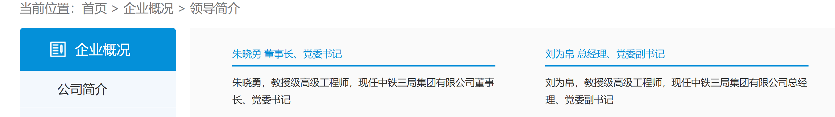 近日,中铁三局集团有限公司官网在“领导简介”栏目也正式公布了集团党委书记、董事长调整的信息,另外,官媒还公布了中铁三局集团有限公司总经理、党委副书记调整的信息。信息显示,刘为帛,教授级高级工程师,现任中铁三局集团有限公司总经理、党委副书记。截图如下,左侧为董事长、党委书记,董事长,右侧为总经理、党委副书记,两人均是教授级高级工程师。