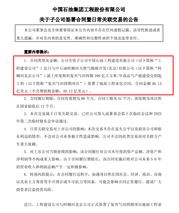 这笔刷新纪录的合同,核心任务是打造复兴气田四期100亿立方米/年的商品气产能。项目位于全球最大陆上气田之一的加尔金内什(复兴)气田,合同有效期66个月,其中建设工期为51个月。