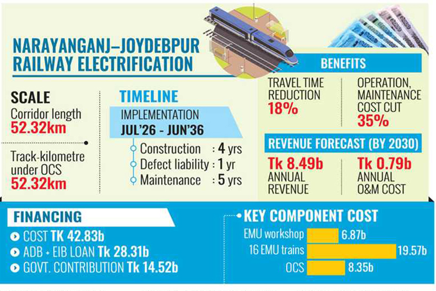 项目计划对一条52.32公里的走廊进行电气化改造,涉及安装架空接触网系统、建设牵引变电站及中央控制系统,同时包括土地征收、采购16列电力动车组以及为期5年的维保服务。项目整体周期为2026年7月至2036年6月,包含约4年建设期及后续维护阶段。目前,该项目已通过孟加拉规划委员会项目评估委员会审议,建议在优化征地规模及压缩实施周期的前提下推进。
