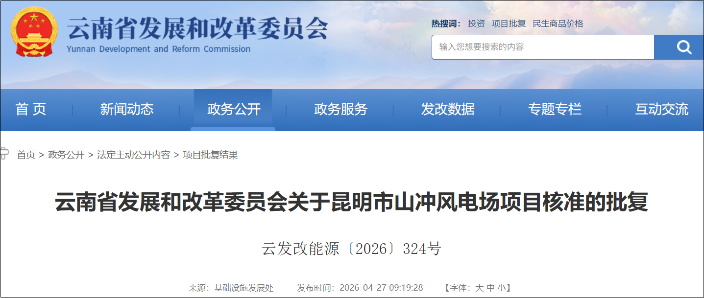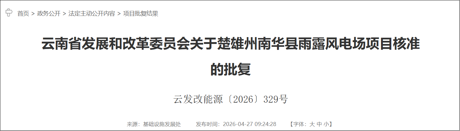 2026年4月27日,云南省发展和改革委员会当日连发两项批复,正式核准昆明市山冲风电场项目与楚雄州南华县雨露风电场项目。这两个风电项目合计总装机达37.375万千瓦,总投资规模突破21.18亿元,标志着云南省在清洁能源基地建设与能源结构优化上再次按下加速键,为全省绿色电力供应增添强劲引擎。