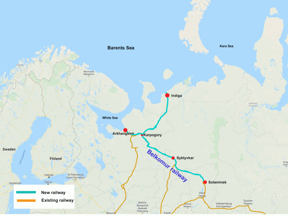 这条铁路是一条较大的预计的Belkomur线的支线,据估计耗资2000亿卢布。Belkomur是一条计划已久的铁路线,从乌拉尔山脉的Solikamsk经过科米共和国的Syktyvkar到达白海边的Arkhangelsk。这条横贯俄罗斯欧洲北部的铁路将把乌拉尔山脉和西伯利亚到阿尔汉格尔斯克的距离缩短800公里。