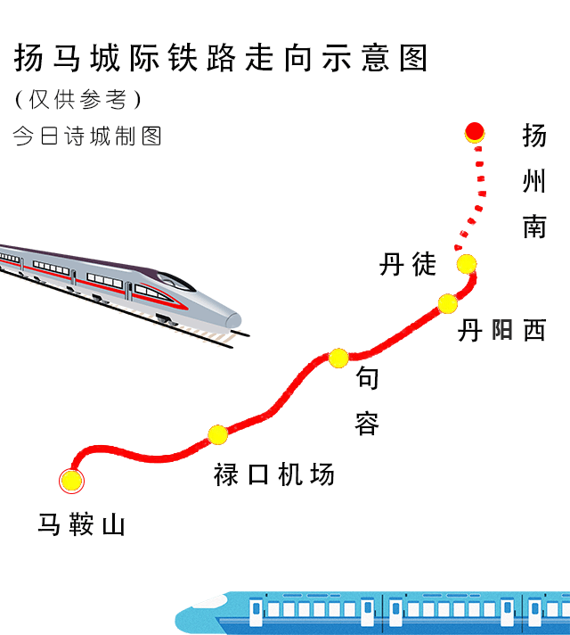项目线路北起扬州南站,经镇江、句容、禄口机场接入拟建的巢马城际铁路马鞍山南站,近期扬州至镇江段利用既有线,新建镇江至马鞍山段。线路全长约122.7公里,其中,马鞍山境内23.7公里,全线拟新建车站3个(上党站、禄口地下站、丹阳站),利用车站3个(丹徒站、句容站、马鞍山南站),设计时速350公里/小时。项目估算总投资289.9亿元,其中安徽段约54.8亿,工程建设期3.5年。
