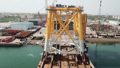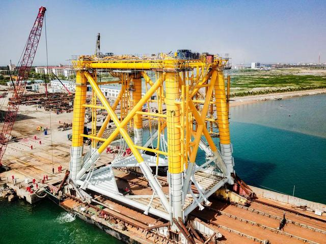 在龙口海工基地,承载海上升压站重量的导管架高达30.7米,总重量约1250吨。它是大海里的“定海神针”,能够承担3900吨升压站平台的负重,同时支撑升压站抵挡高强度台风和潮涌的侵袭。