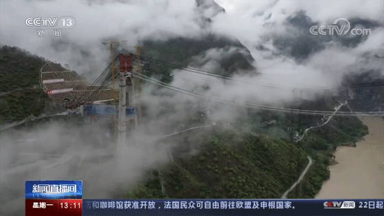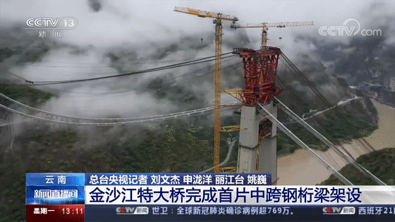 由于施工场地受限,缆塔塔顶至钢梁拼装场高差330米,也是目前世界上起吊高度最大的缆索吊,由于整座大桥跨越金沙江,两岸山体陡峭,缆塔塔顶至钢梁拼装场高差达到330米。金沙江特大桥钢梁共计71个节间,边跨21个,中跨50个,其中中跨采用双节间整体吊装,共计25个双节段,预计大桥的吊装将在3个月左右的时间里完成。