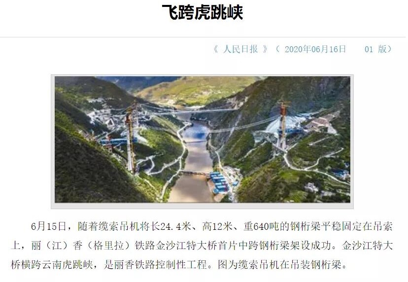 金沙江特大桥位于云南省丽江市与香格里拉市交界处,横跨云南虎跳峡,是丽香铁路控制性工程。大桥全长882.5米,主桥采用悬吊上承式钢桁梁悬索桥,两端均与隧道连接,两岸山体陡峭,需要吊装的这片中跨钢桁梁长24.4米、高12米、重640吨,操作难度非常大。