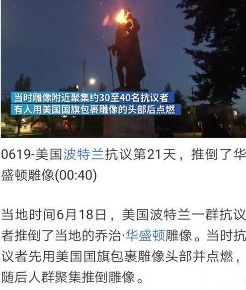 日前,美国奥勒冈州波特兰反歧视示威者在该市东北部杰佛逊高中拉倒“独立宣言”起草人、第3任总统杰佛逊雕像后,又在当地时间18日深夜拉倒波特兰东北部德裔美国人协会草坪上的“国父”华盛顿雕像,原因是华盛顿当年也蓄奴。