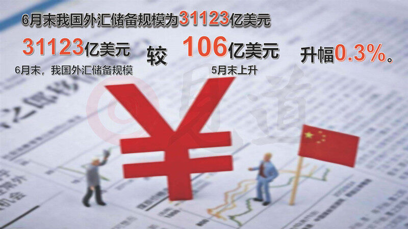 截至2020年6月末,我国外汇储备规模为31123亿美元,较5月末上升106亿美元,升幅0.3%。