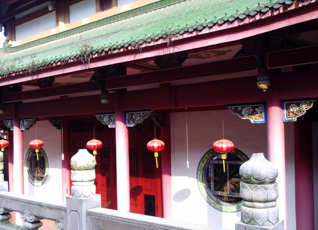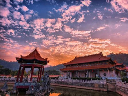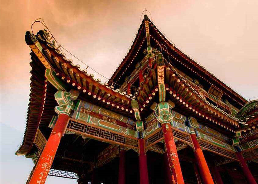 中国的寺院建筑样式与宫殿相似,更多地融会了中国宫殿建筑的美学特征,在时间进程和空间的形式上都具有共同的特征:屋顶的形状和装饰占重要地位,屋顶的曲线和微翘的飞檐呈现着向上、向外的张力,配以宽厚的正身与廓大的台基,主次分明,升降有致,加上严谨对称的结构布局,使整个建筑群显得庄严浑厚,行观其间,就可体验到强烈的节奏感和鲜明的流动美。