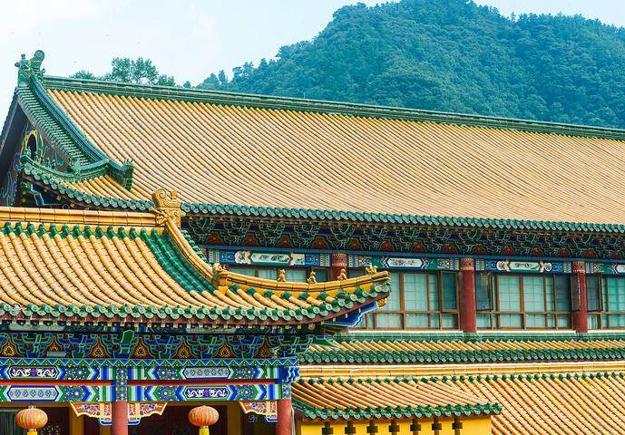 屋顶,寺院建筑的主体部分,体型都显得庞大笨拙,但在屋顶上却利用木结构的特点把屋顶做成曲面形。寺院屋顶造型有歇山顶、悬山顶、硬山顶、攒尖顶等,庑殿,歇山屋顶又有单据和重檐两种。
