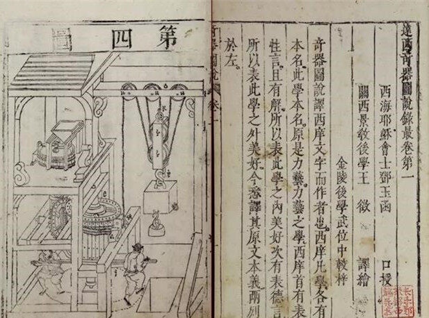 此时的欧洲和中国以外的其它地方,都未曾发现比中国更早的版本存在。即便史学家们把《几何原本》原作者的桂冠安在欧几里得的头上,但这种命名更像是一种人为的定义,而缺少证据的支撑。《远西奇器图说》则和达芬奇的某些机械手稿一样,带有明显《武经总要》、《天工开物》为代表中国传统技术典籍的影子与神韵。这种熟悉的感觉并不是中国本土的画师和合作者造成的,因为无论中国的技术典籍、带有时代特色的画作还是实际应用的各种机械,都是寻常的存在。