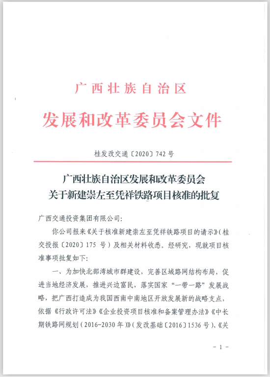 2020年7月16日,广西南崇铁路有限责任公司发布公告,新建崇左至凭祥铁路项目(以下简称崇凭铁路)获广西壮族自治区发展和改革委员会核准批复同意。按照工作计划,2020年内可实现开工建设。