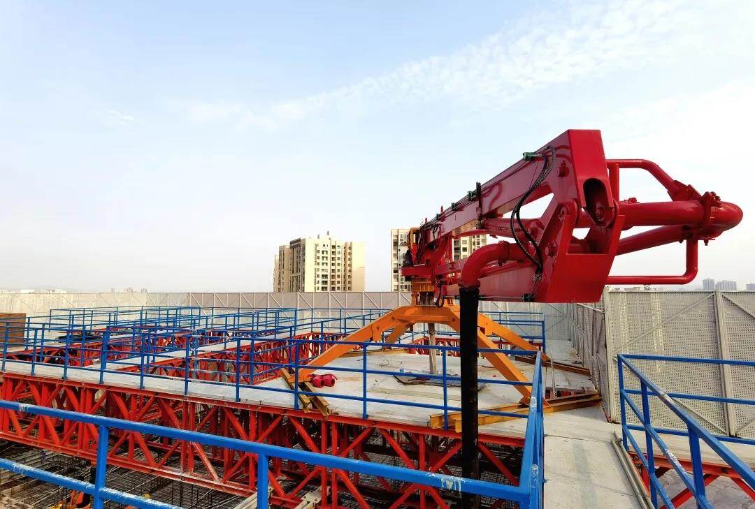 其三,集成程度更高,首次实现顶部雨篷设备、外围竖向模板、布料机一次性整体爬升,还可将操作架、模板、工机具、配电箱等布设于平台内,实现同步提升,减少物料周转,为作业工人减负,大量节约人力成本,使用更方便。