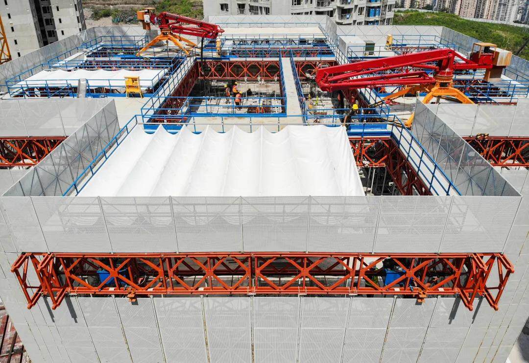 “住宅造楼机”利用钢平台走道形成13个4-8米宽的单元洞口,每个洞口安装可伸缩雨篷,平时施工时,可开启雨篷吊装材料;暴雨天气来临,可随时关闭雨篷遮雨;高温天气,可关闭雨篷、开启喷雾装置进行降温。无论刮风下雨、艳阳高照,作业层内均可提供全天候封闭作业环境,为工友提供更加舒适、人性化的作业环境,基本达到现场施工“风雨无阻”的条件,形成“全景式空中生产线”。