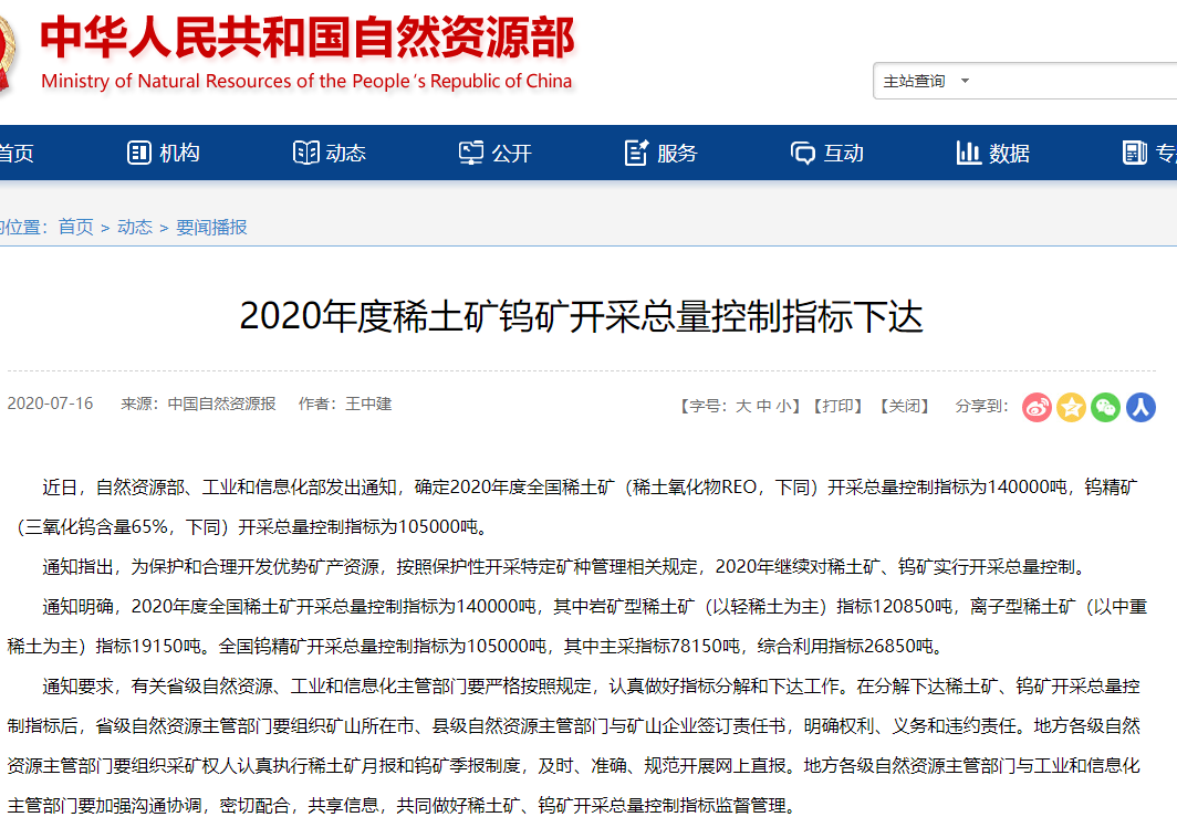2020年7月17日,见道网从中国自然资源部官网获悉, 2020年中国对稀土矿、钨精矿实行开采总量控制,2020年中国稀土矿开采总量控制指标为140000吨,2020年中国钨精矿开采总量控制指标为105000吨。