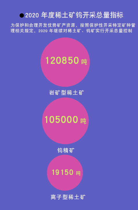 通知称,为保护和合理开发优势矿产资源,按照保护性开采特定矿种管理相关规定,2020年继续对稀土矿、钨矿实行开采总量控制。