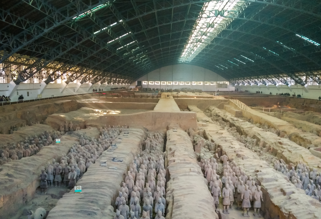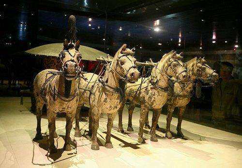 The center of the mausoleum is the place where the coffin of Qin Shihuang is placed. There are more than 400 burial pits and tombs around the tomb. The main burial pits include bronze carts, horse pits, rare birds and animals pits, stables pits and terracotta warriors and horses pits. A group of two-passenger large-scale painted copper carriages and horses unearthed in 1980-Gaoche and Anche, are the largest, most ornately decorated, and most realistic and complete ancient copper carriages and horses discovered in China to date. Known as the "Crown of Bronze".