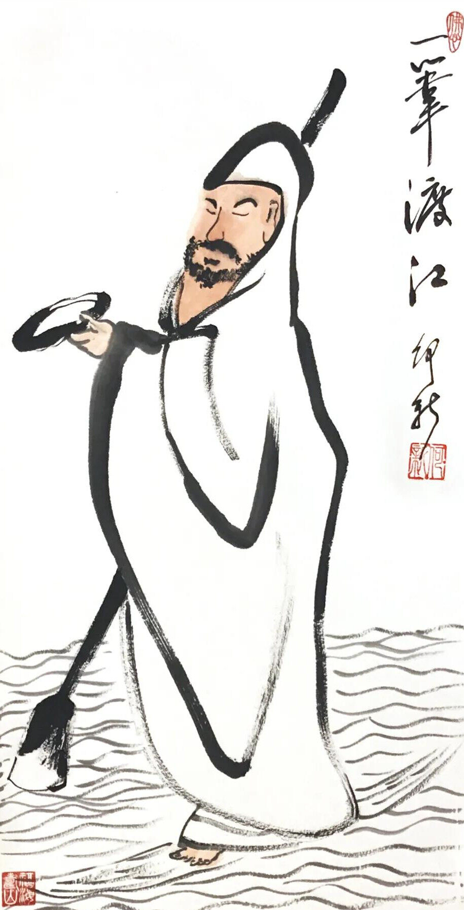 注:一苇渡江是达摩祖师的宗教故事。达摩传说渡过长江时,并不是坐船,而是在江岸折了一根芦苇,立在苇上过江的。