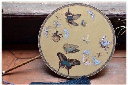 对称合欢扇,又称宫扇、纨扇、团扇,其形尚圆,合欢扇特点是面素白色以扇柄为中轴,左右对称似圆月,纨扇以竹木为架,面成圆形或椭圆形,用薄丝绢糊成。当时以中原一带所制纨扇最为考究,有齐纨楚竹之说,即指用山东绢和湖南竹制作扇面的纨扇。