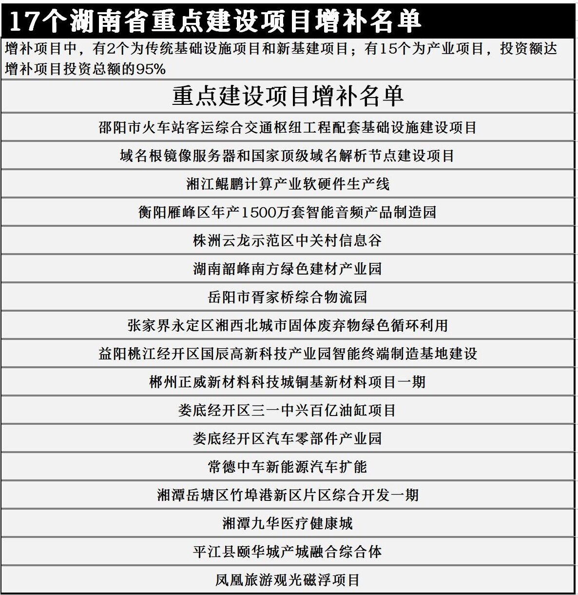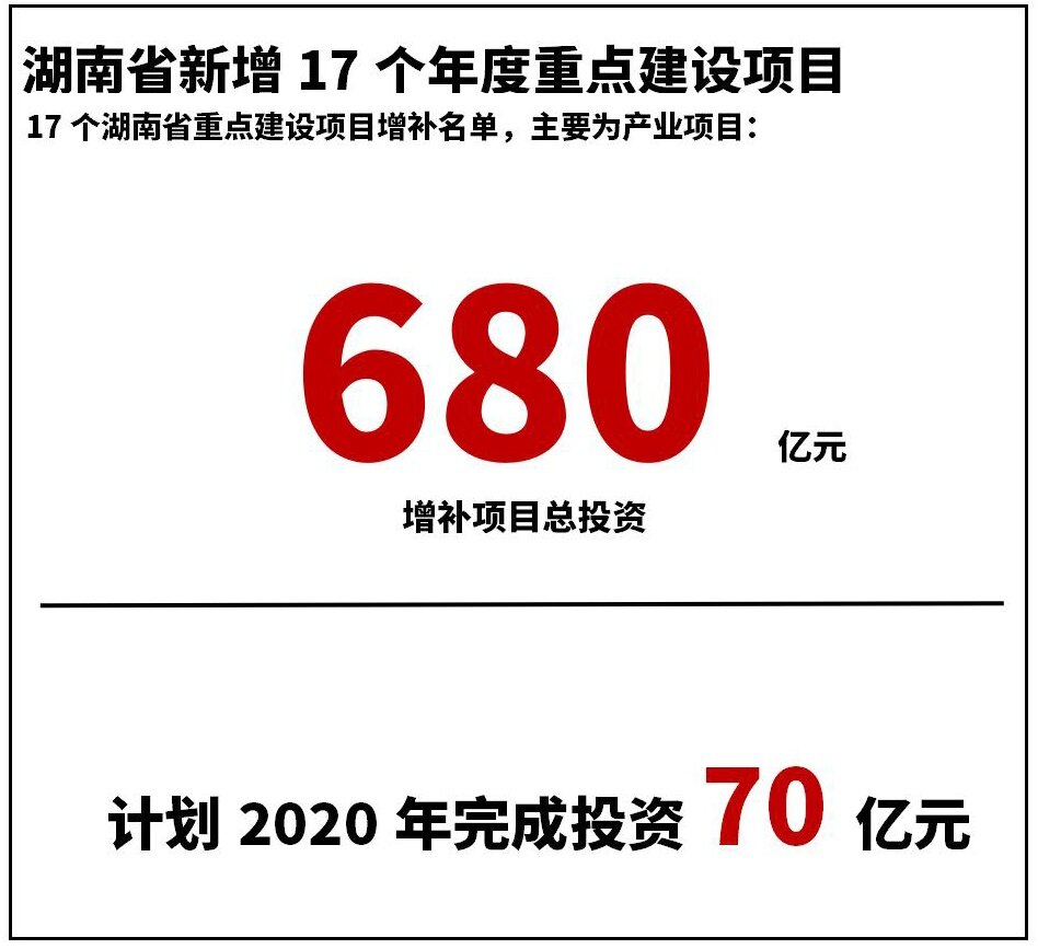 2020年8月11日,湖南省发改委官方网站发布了17个湖南省重点建设项目增补名单,主要为产业项目。增补项目总投资680亿元,计划2020年完成投资70亿元。