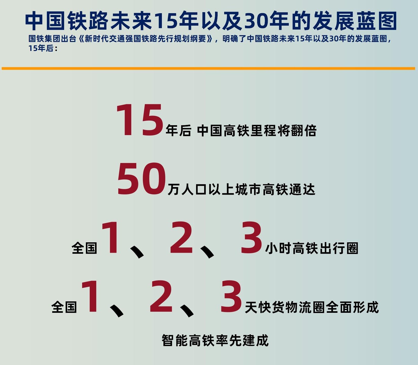 《规划纲要》提出,到2035年,中国将建成国际领先的现代化铁路强国,现代化铁路网率先建成。全国铁路网20万公里左右,其中高铁7万公里左右。20万人口以上城市实现铁路覆盖,其中50万人口以上城市高铁通达。到2050年,将全面建成更高水平的现代化铁路强国,建成更加发达完善的现代化铁路网。