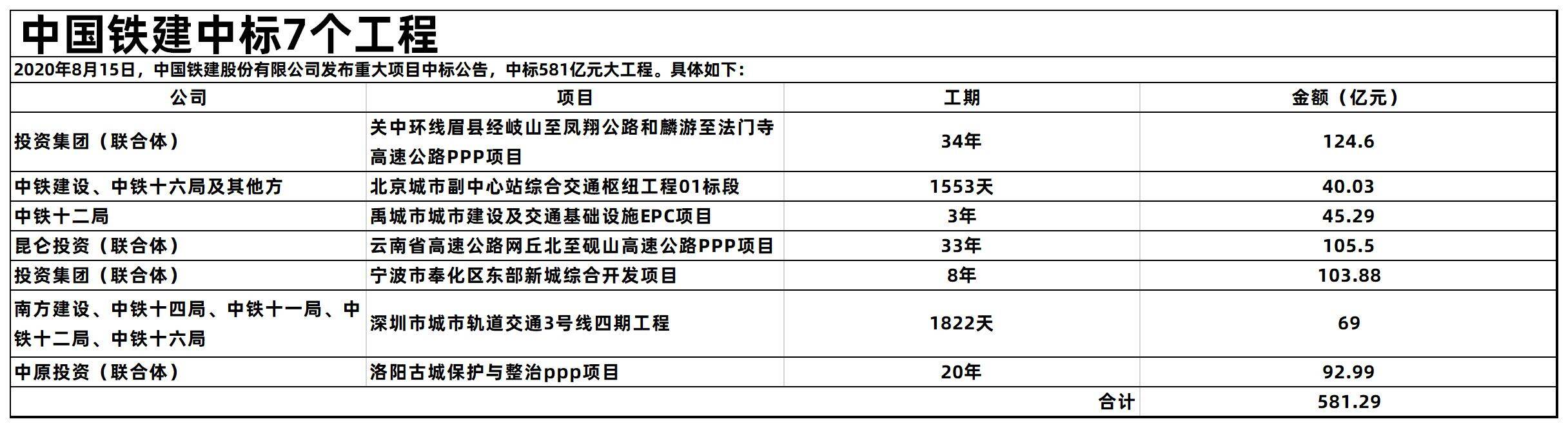 2020年8月15日,中国铁建股份有限公司发布重大项目中标公告,中标581亿元大工程。具体如下: