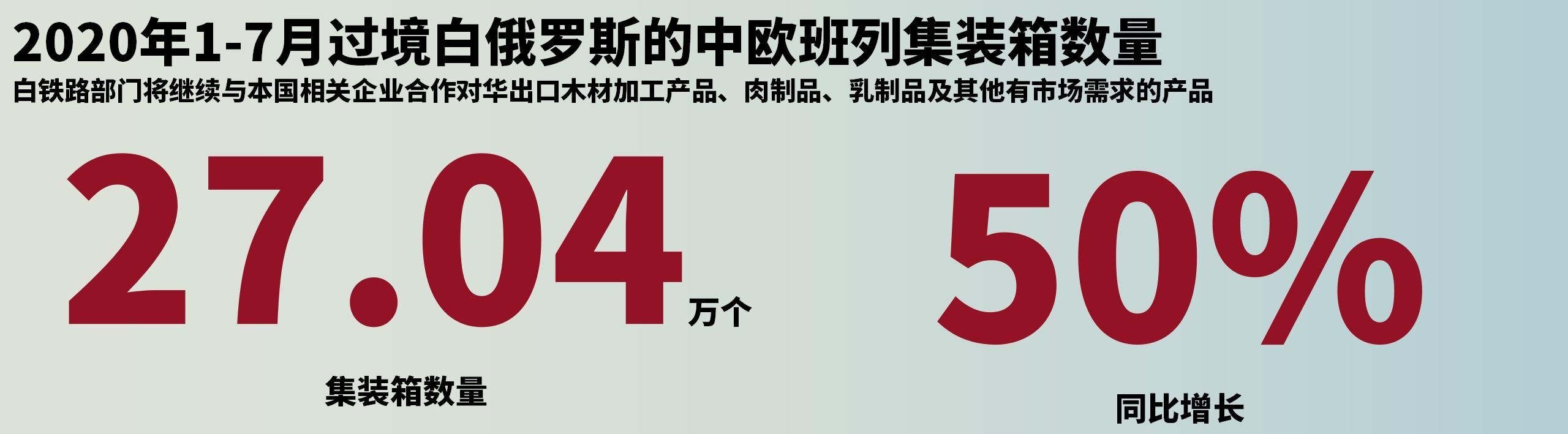 白铁路部门说,发展过境白俄罗斯的中欧班列集装箱运输是其战略方向。2020年1到7月,过境白俄罗斯的中欧班列运输的集装箱为数量为27.04万个,同比增长50%。白铁路部门将继续与本国相关企业合作对华出口木材加工产品、肉制品、乳制品及其他有市场需求的产品。