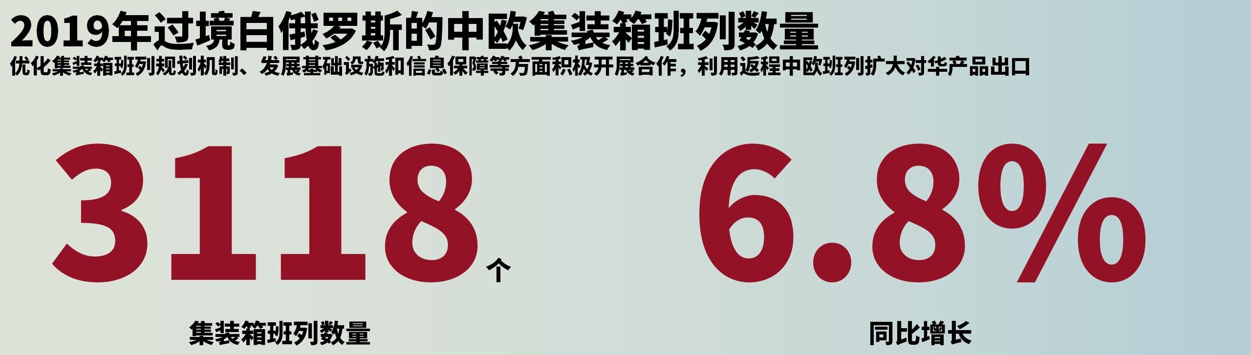 2019年过境白俄罗斯的中欧集装箱班列数量达到3118个,同比增长6.8%;所运输集装箱数量达到33.85万个,同比增长增长2.1%。