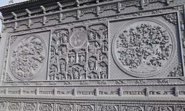 在青砖上雕刻出人物、山水、花卉等图案,是古建筑雕刻中很重要的一种艺术形式,主要用于装饰寺塔、墓室、房屋等建筑物的构件和墙面。粉墙上饰以砖雕、石雕花窗,或放长条石桌、石凳,点缀小品,使建筑、山水、花木融为一体,庭院小,颇得园林之趣。