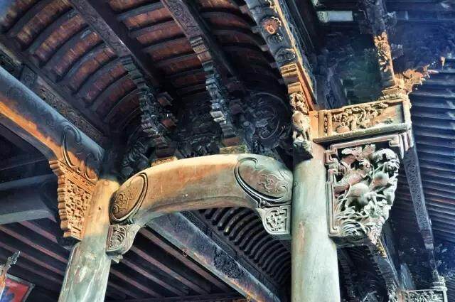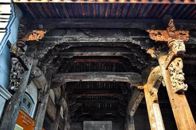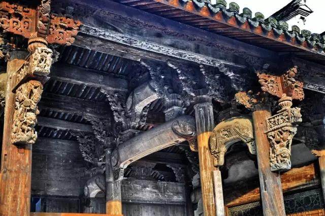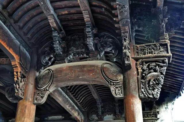 石雕、砖雕囿于材质坚硬,并未见有精妙之处;而木雕把不同类别的东西组合在一起,如人物、花鸟、山水、八宝博古、几何形等共处一个画面上,主次分明,各起各的作用,显得民间风味浓郁,装饰性强。
