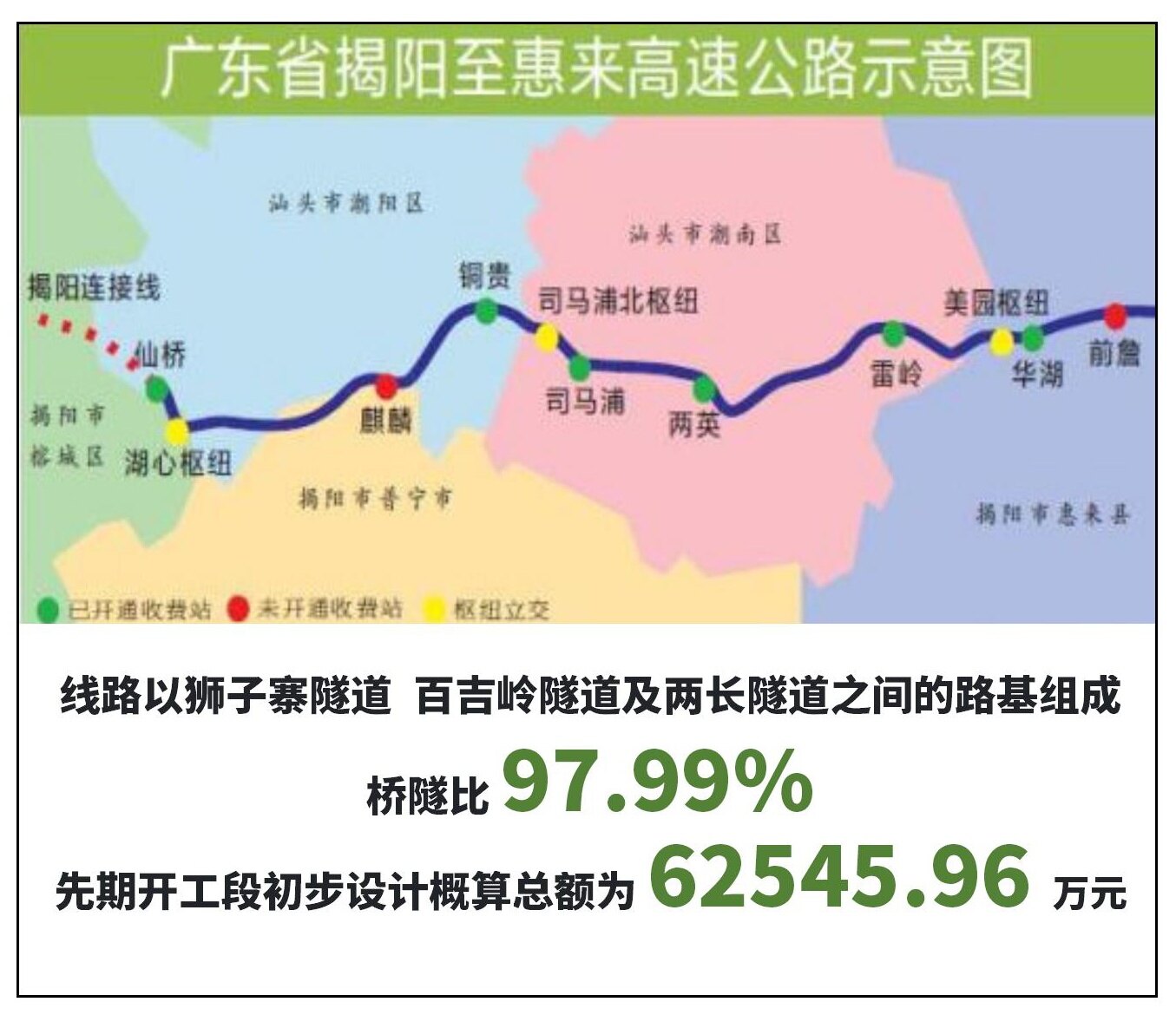 据悉,揭阳-惠来铁路先期开工段线路走行于普宁市与惠来县之间的大南山,线路长度11.173公里,范围为:狮子寨隧道至百吉岭隧道站前工程(DK56+022~DK67+195)。该段线路主要以狮子寨隧道、百吉岭隧道及两长隧道之间的路基组成,路基地段沿线分布有部分危岩落石,桥隧比97.99%,先期开工段初步设计概算总额为62545.96万元。