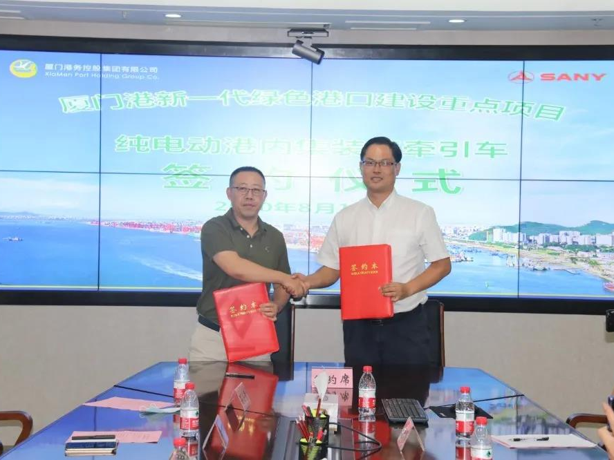 近日,三一海工与厦门港务运输有限公司成功签署一项战略合作协议,协议包含35部最新研制的三一SM4252T0BEV型纯电动港口牵引车,将在2020年10月、12月分批交付给客户使用,助力厦门港完成新一代绿色港口建设的目标。