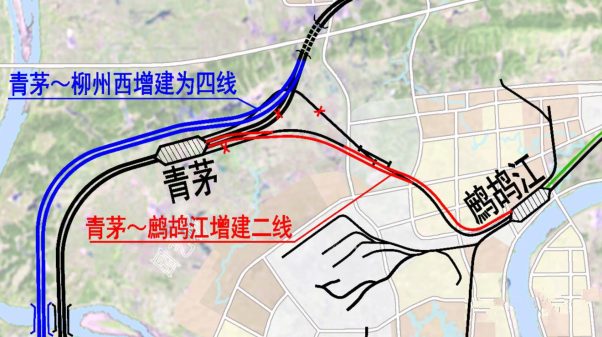 本段既有衡柳线为双线,为实现客外货内四线模式,衡柳线于青茅进站端曲线切圆至青茅车站北侧通过,不进入青茅车站,沿既有衡柳线方向至柳江,新建柳江双线特大桥(上游)跨越柳江,上跨既有黔桂线后左右线分线,左线先后上跨既有衡柳右线、既有黔桂线及既有衡柳左线,于白露大桥前与既有衡柳左线并行下穿白露大桥进入柳州西站;右线沿既有衡柳右线方向下穿白露大桥后进入柳州西站。